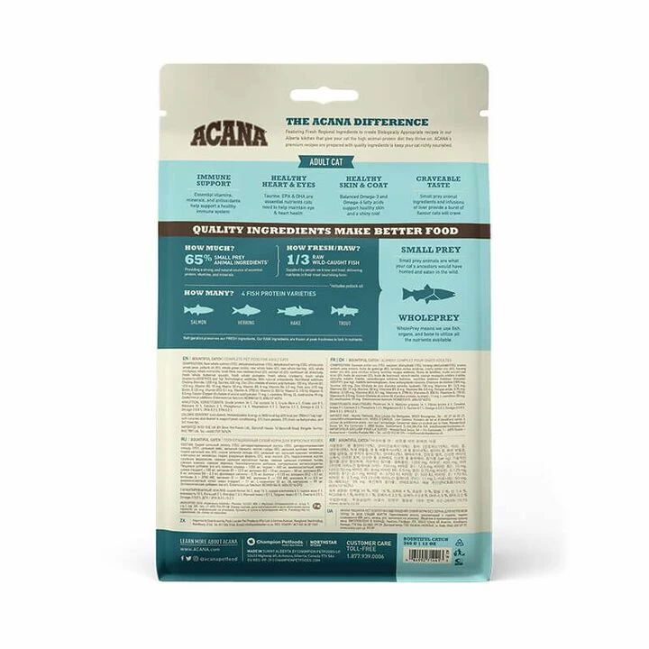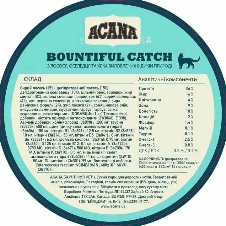 сирий лосось (18 %), лосось дегідратований (15 %), оселедець дегідратований (15 %), вівсяна крупа, цільний горох, риб'ячий жир (6 %), цільна зелена сочевиця, хек сирий (4 %), цільний сирий оселедець (4 %), цільний нут, цільна червона сочевиця, соняшникова олія, сира форель (3 %), клітковина сочевиці, карбонат кальцію, висушена ламінарія, свіжий цільний мускатний гарбуз, свіжий цільний гарбуз, цільні ягоди журавлини, цільні ягоди чорниці.