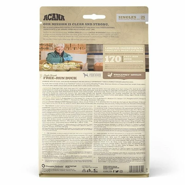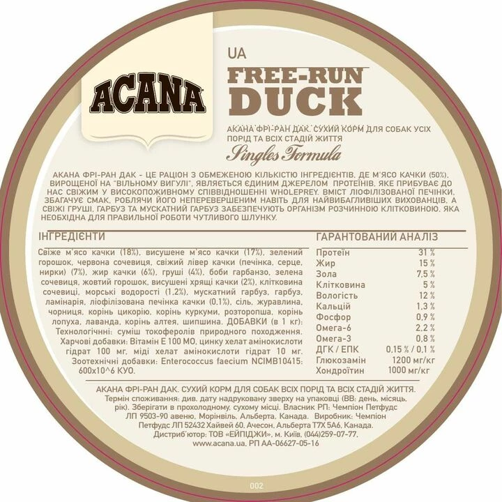 Сира качка (18%), дегідратована качка (17%), цільний зелений горошок, цільна червона сочевиця, сира печінка качки (9%), жир з качки(6%), свіжі груші (4%), цільний нут, цільна зелена сочевиця, цільний жовтий горошок, гороховий крохмаль, клітковина сочевиці, водорості (джерело ЕПК і ДГК) (1,2%), свіжий цільний мускатний гарбуз, свіжий цільний гарбуз, сушена ламінарія, сіль, сушений корінь цикорію, цільна журавлина, цільна чорниця, куркума, розторопша, корінь лопуха, лаванда, корінь алтеї, шипшина.