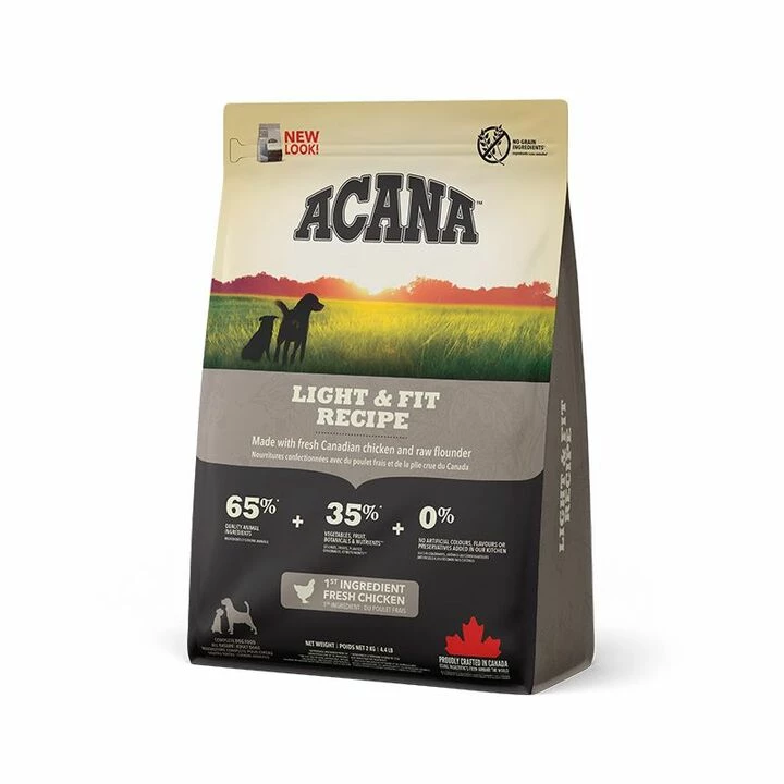 Основа сухого раціону - високоякісні м'ясні білки, які необхідні для всіх процесів життєдіяльності. Корм Acana Light & Fit Recipe містить мінімальну кількість калорій серед усіх раціонів бренду та низький рівень жирів, щоб контролювати вагу тварини. Додавання до складу рослинної клітковини забезпечує тривалу ситість і дає змогу поступово знижувати масу тіла улюбленця без відчуття голоду.