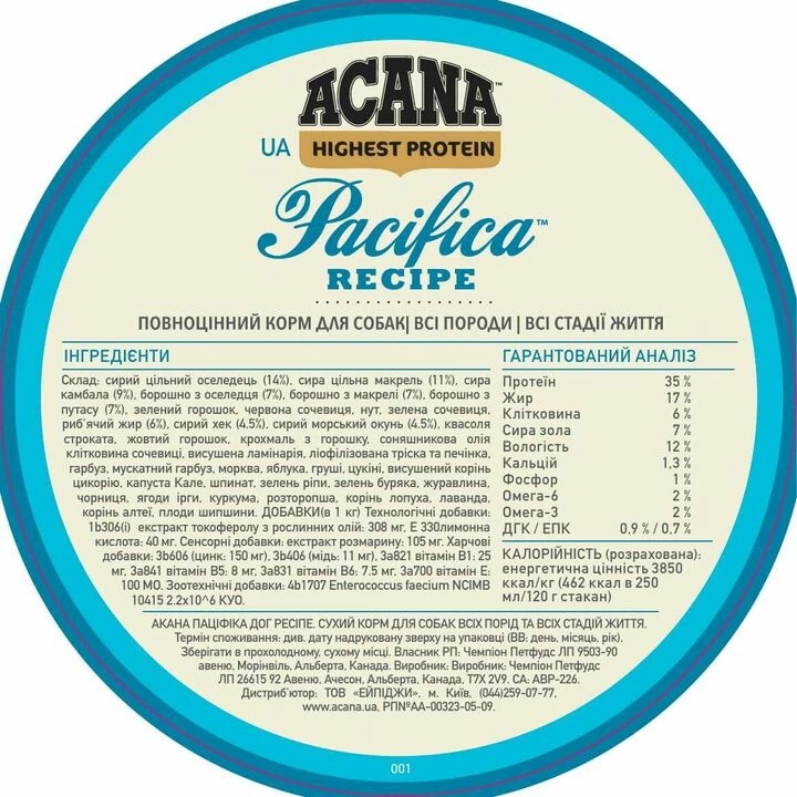 Раціон ACANA Pacifica створений у відповідності до рівнів поживності встановлених FEDIAF для собак всіх стадій життя, включаючи період зростання цуценят великих порід.