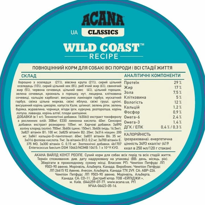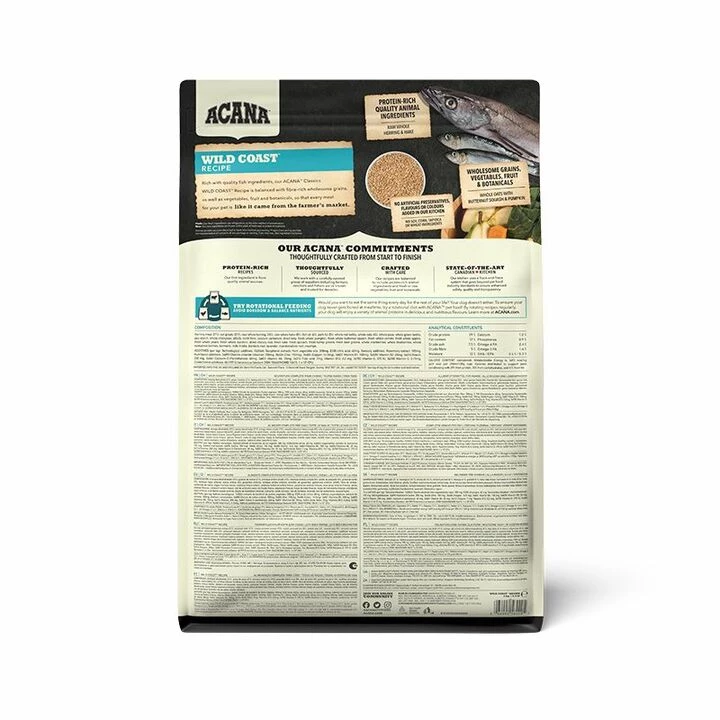 ACANA Wild Coast створений відповідно до рівнів поживності, встановлених FEDIAF для всіх стадій життя, включаючи собак в період зростання (від 30 кг та більше).