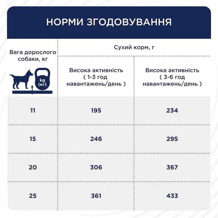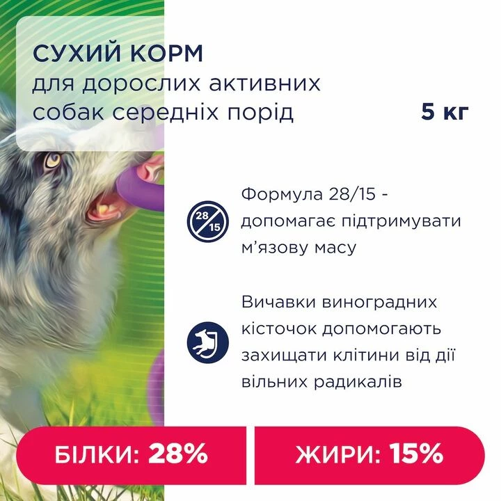 Поживна цінність (аналітичні компоненти) корму: сирий протеїн 28 %, сирий жир 15 %, сира зола 6 %, сира клітковина 2,3 %, кальцій 1,4 %, фосфор 1,1 %, вологість 9 %, омега-3 жирні кислоти 0,34 %, омега-6 жирні кислоти 3,27 %. 63 % протеїнів корму – тваринного походження.