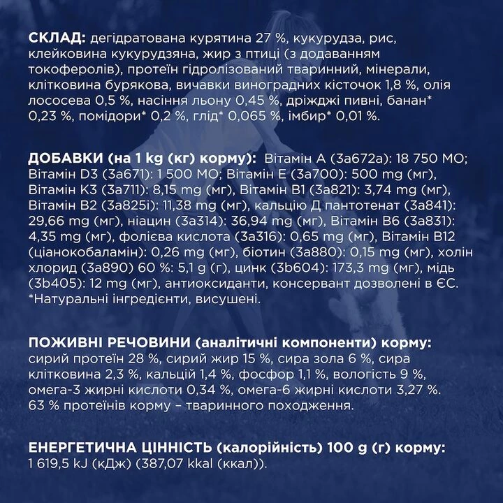 дегідратована курятина 27 %, кукурудза, рис, клейковина кукурудзяна, жир з птиці (з додаванням токоферолів), протеїн гідролізований тваринний, мінерали, клітковина бурякова, вичавки виноградних кісточок 1,8 %, олія лососева 0,5 %, насіння льону 0,45 %, дріжджі пивні, банан* 0,23 %, помідори* 0,2 %, глід* 0,065 %, імбир* 0,01 %