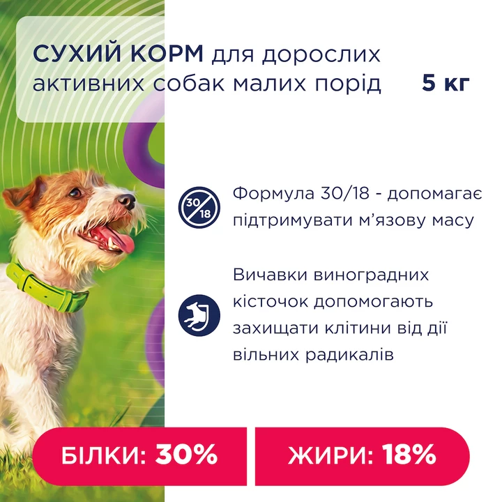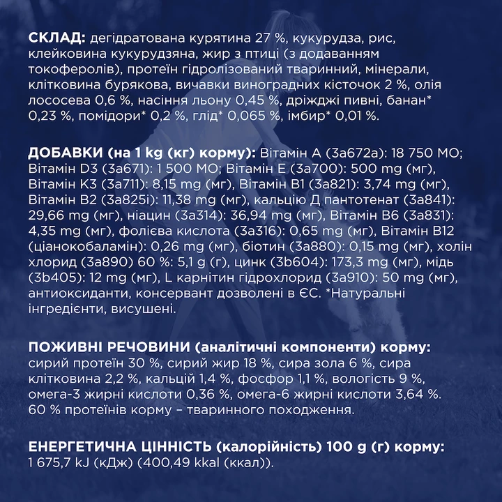 дегідратована курятина 27 %, кукурудза, рис, клейковина кукурудзяна, жир з птиці (з додаванням токоферолів), протеїн гідролізований тваринний, мінерали, клітковина бурякова, вичавки виноградних кісточок 2 %, олія лососева 0,6 %, насіння льону 0,45 %, дріжджі пивні, банан* 0,23 %, помідори* 0,2 %, глід* 0,065 %, імбир* 0,01 %.