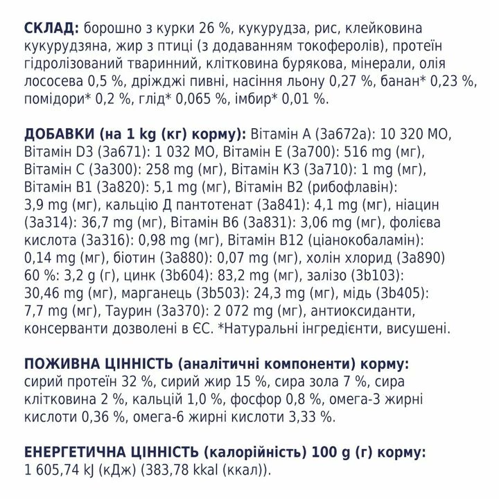 Склад: борошно з курки 26 %, кукурудза, рис, клейковина кукурудзяна, жир з птиці (з додаванням токоферолів), протеїн гідролізований тваринний, клітковина бурякова, мінерали, олія лососева 0,5 %, дріжджі пивні, насіння льону 0,27 %, банан* 0,23 %, помідори* 0,2 %, глід* 0,065 %, імбир* 0,01 %.