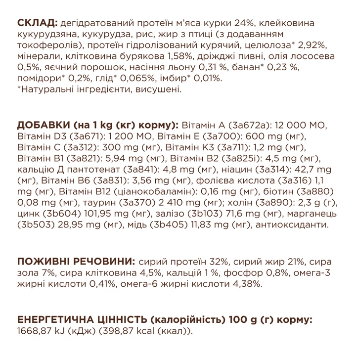 Борошно з курки 24 %, клейковина кукурудзяна, кукурудза, рис, жир з птиці (з додаванням токоферолів), протеїн гідролізований тваринний, целюлоза* 2,92 %, мінерали, клітковина бурякова 1,58 %, дріжджі пивні, олія лососева 0,5 %, яєчний порошок, насіння льону 0,31 %, банан* 0,23 %, помідори* 0,2 %, глід* 0,065 %, імбир* 0,01 %.