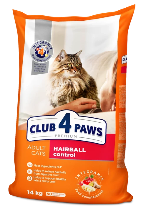 Особлива формула преміум-раціону розроблена з урахуванням відгуків ветеринарів і враховує всі особливості травлення тварини. У складі харчування Клуб 4 Лапи для котів з ефектом виведення шерсті Hairball Control є різні види рослинної клітковини. Вони стимулюють моторику шлунково-кишкового тракту і сприяють просуванню волосяних грудочок для їх безперешкодного виділення під час дефекації.