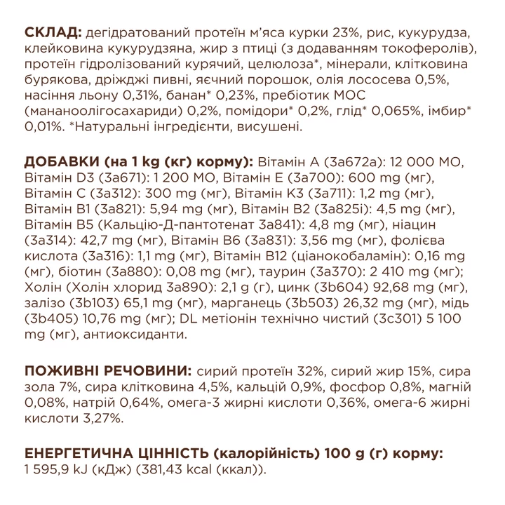 - поліпшує роботу травної системи, відновлює мікрофлору кишківника за допомогою пребіотика МОС і нормалізує консистенцію випорожнень завдяки рослинній клітковині;