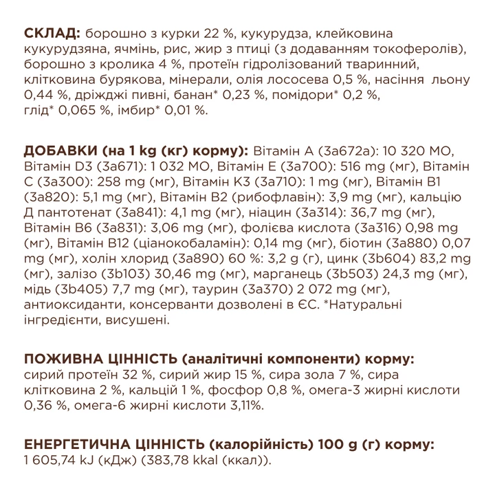 Борошно з курки 22 %, кукурудза, клейковина кукурудзяна, ячмінь, рис, жир з птиці (з додаванням токоферолів), борошно з кролика 4 %, протеїн гідролізований тваринний, клітковина бурякова, мінерали, олія лососева 0,5 %, насіння льону 0,44 %, дріжджі пивні, банан* 0,23 %, помідори* 0,2 %, глід* 0,065 %, імбир* 0,01 %.