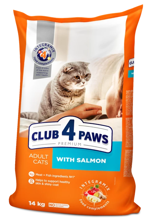 Преміум-раціон із комбінацією м'ясної та рибної сировини - ідеальна комбінація, що відповідає природним потребам і вподобанням тварини. Яскравий аромат і хороші смакові якості стимулюють апетит, тому навіть вибагливі улюбленці із задоволенням їдять сухий корм Клуб 4 Лапи з лососем для котів.