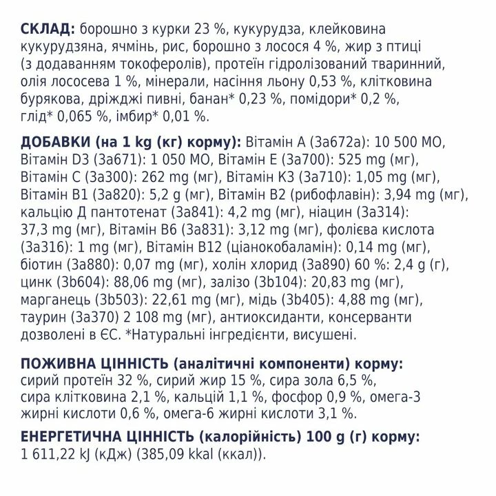 Борошно з курки 23%, кукурудза, клейковина кукурудзяна, ячмінь, рис, борошно з лосося 4%, жир з птиці (з додаванням токоферолів), протеїн гідролізований тваринний, масло лосося 1%, мінерали, насіння льону 0,53%, клітковина бурякова, дріжджі пивні, банан * 0,23%, помідори * 0,2%, глід * 0,065%, імбир * 0,01%.