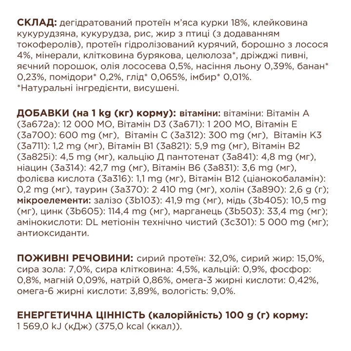 СКЛАД: дегідратований протеїн м’яса курки 18 %, клейковина кукурудзяна, кукурудза, рис, жир з птиці (з додаванням токоферолів), протеїн гідролізований курячий, борошно з лосося 4 %, мінерали, клітковина бурякова, целюлоза*, дріжджі пивні, яєчний порошок, олія лососева 0,5%, насіння льону 0,39 %, банан* 0,23%, помідори* 0,2%, глід* 0,065%, імбир* 0,01%.