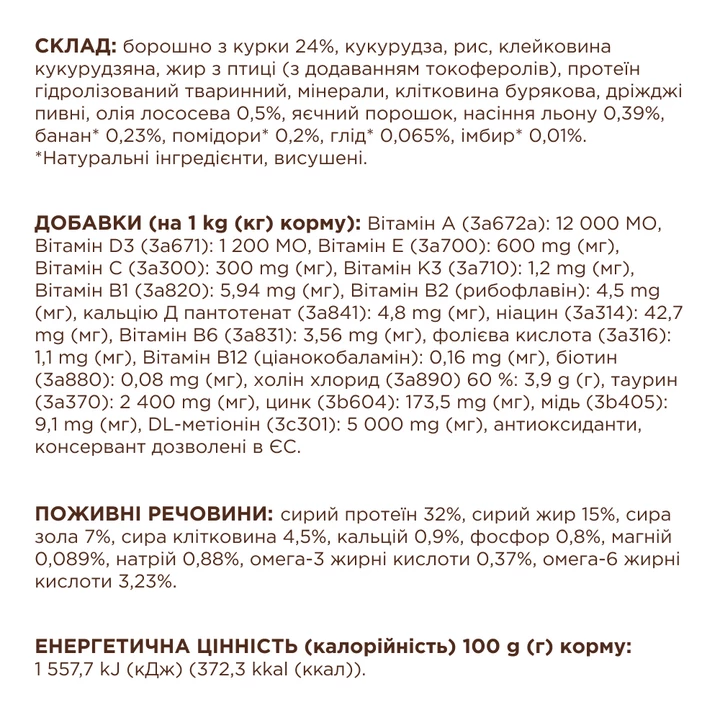 Борошно з курки 24 %, кукурудза, рис, клейковина кукурудзяна, жир з птиці (з додаванням токоферолів), протеїн гідролізований тваринний, мінерали, клітковина бурякова, дріжджі пивні, олія лососева 0,5 %, яєчний порошок, насіння льону 0,39 %, банан* 0,23 %, помідори* 0,2 %, глід* 0,065 %, імбир* 0,01 %.