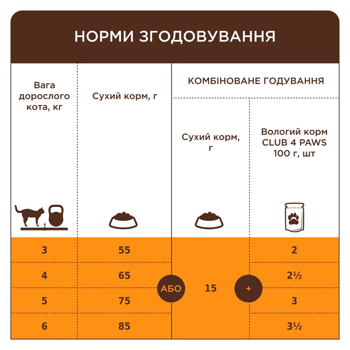 Сухий раціон містить високий рівень м'ясних протеїнів, що становлять основу живлення котів та відповідають їхнім природнім вподобанням при виборі корму. Корисні жири в складі сухих гранул Club 4 Paws з телятиною для котів дають енергію для життєдіяльності.