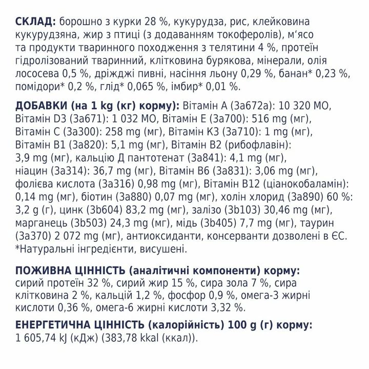 Борошно з курки 28 %, кукурудза, рис, клейковина кукурудзяна, жир з птиці (з додаванням токоферолів), м‘ясо та продукти тваринного походження з телятини 4 %, протеїн гідролізований тваринний, клітковина бурякова, мінерали, олія лососева 0,5 %, дріжджі пивні, насіння льону 0,29 %, банан* 0,23 %, помідори* 0,2 %, глід* 0,065 %, імбир* 0,01 %.