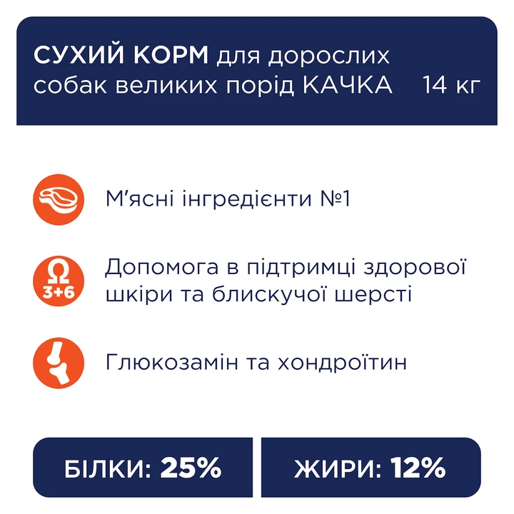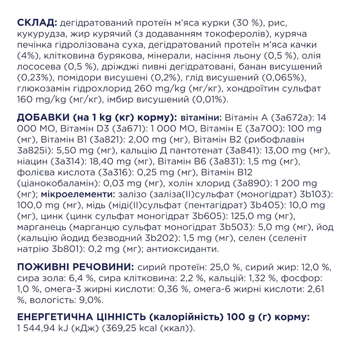 Поживні речовини: сирий протеїн: 25,0 %, сирий жир: 12,0 %, сира зола: 6,4 %, сира клітковина: 2,2 %, кальцій: 1,32 %, фосфор: 1,0 %, омега-3 жирні кислоти: 0,36 %, омега-6 жирні кислоти: 2,61 %, вологість: 9,0%.