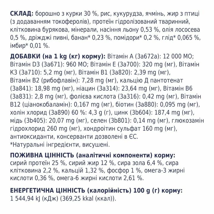 Борошно з курки 30 %, рис, кукурудза, ячмінь, жир з птиці (з додаванням токоферолів), протеїн гідролізований тваринний, клітковина бурякова, мінерали, насіння льону 0,53 %, олія лососева 0,5 %, дріжджі пивні, банан* 0,23 %, помідори* 0,2 %, глід* 0,065 %, імбир* 0,01 %.
