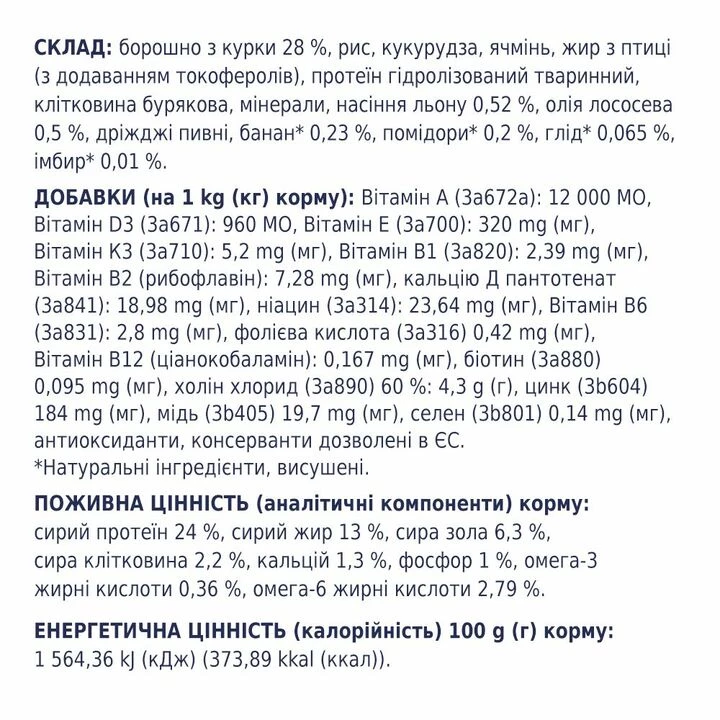 Борошно з курки 28 %, рис, кукурудза, ячмінь, жир з птиці (з додаванням токоферолів), протеїн гідролізований тваринний, клітковина бурякова, мінерали, насіння льону 0,52 %, олія лососева 0,5 %, дріжджі пивні, банан* 0,23 %, помідори* 0,2 %, глід* 0,065 %, імбир* 0,01 %.