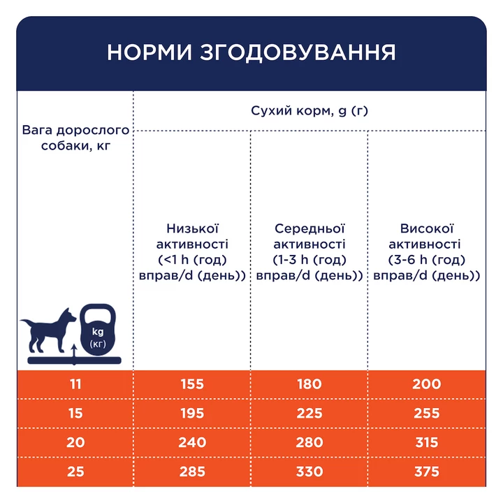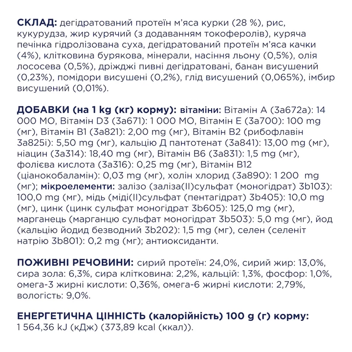 Поживні речовини: сирий протеїн: 24,0%, сирий жир: 13,0%, сира зола: 6,3%, сира клітковина: 2,2%, кальцій: 1,3%, фосфор: 1,0%, омега-3 жирні кислоти: 0,36%, омега-6 жирні кислоти: 2,79%, вологість: 9,0%.