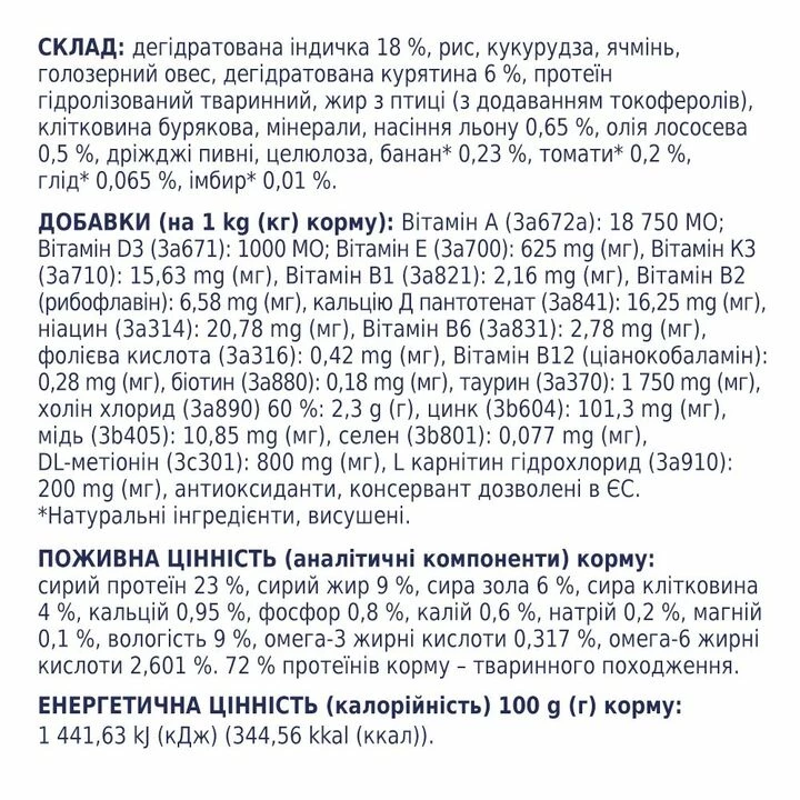 Склад: дегідратована індичка 18 %, рис, кукурудза, ячмінь, голозерний овес, дегідратована курятина 6 %, протеїн гідролізований тваринний, жир з птиці (з додаванням токоферолів), клітковина бурякова, мінерали, насіння льону 0,65 %, олія лососева 0,5 %, дріжджі пивні, целюлоза, банан* 0,23 %, томати* 0,2 %, глід* 0,065 %, імбир* 0,01 %.