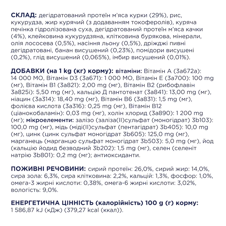 Поживні речовини: сирий протеїн: 26,0%, сирий жир: 14,0%, сира зола: 6,3%, сира клітковина: 2,2%, кальцій: 1,3%, фосфор: 1,0%, омега-3 жирні кислоти: 0,38%, омега-6 жирні кислоти: 3,02%, вологість: 9,0%.