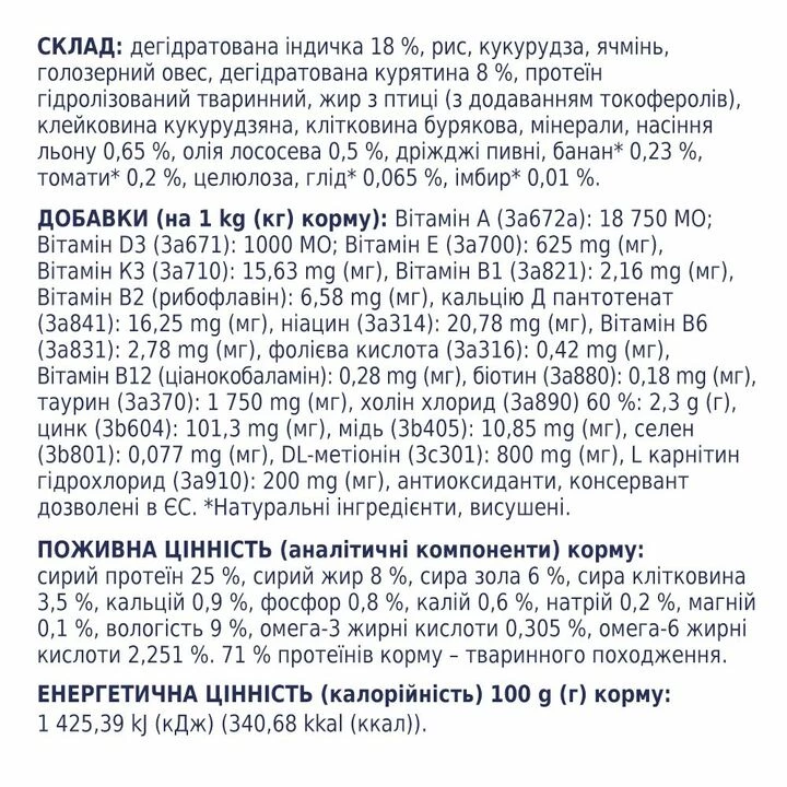 Склад: дегідратована індичка 18 %, рис, кукурудза, ячмінь, голозерний овес, дегідратована курятина 8 %, протеїн гідролізований тваринний, жир з птиці (з додаванням токоферолів), клейковина кукурудзяна, клітковина бурякова, мінерали, насіння льону 0,65 %, олія лососева 0,5 %, дріжджі пивні, банан* 0,23 %, томати* 0,2 %, целюлоза, глід* 0,065 %, імбир* 0,01 %.