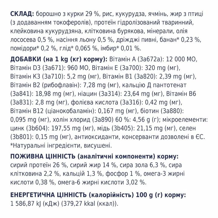 Борошно з курки 29 %, рис, кукурудза, ячмінь, жир з птиці (з додаванням токоферолів), протеїн гідролізований тваринний, клейковина кукурудзяна, клітковина бурякова, мінерали, олія лососева 0,5 %, насіння льону 0,5 %, дріжджі пивні, банан* 0,23 %, помідори* 0,2 %, глід* 0,065 %, імбир* 0,01 %.