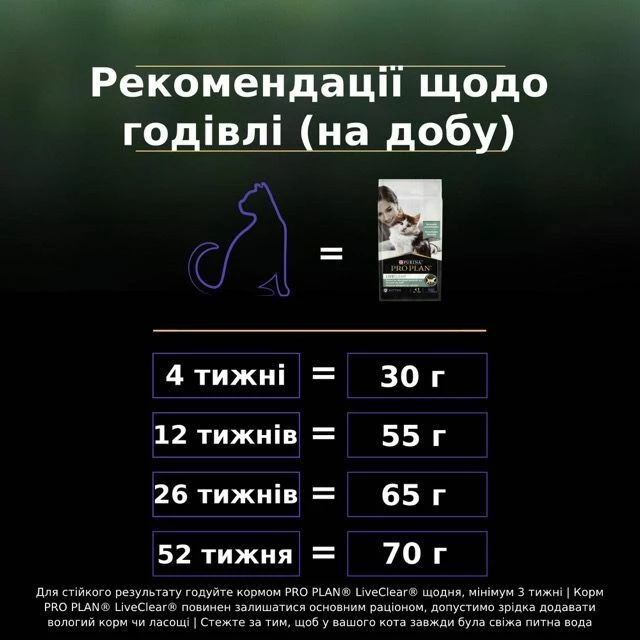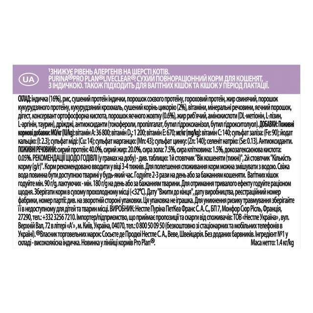 У складі Purina Pro Plan LiveClear Kitten для кошенят для зменшення алергенів на шерсті з індичкою присутні всі необхідні нутрієнти: