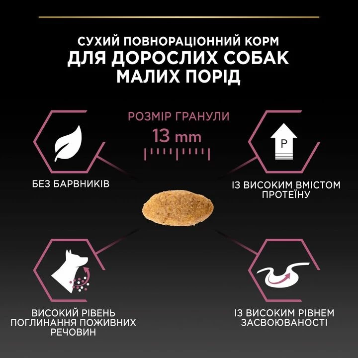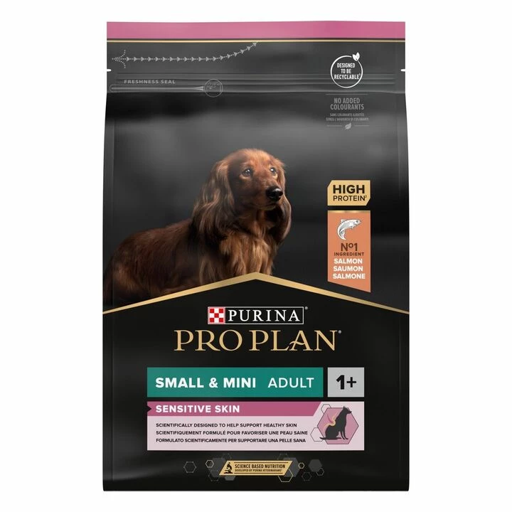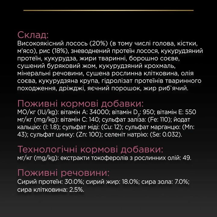 Формула включає відібрані джерела протеїнів, які легко засвоюються і зазвичай не викликають небажаних реакцій. У складі корму Про План для дрібних порід з лососем немає глютену (клейковини), синтетичних ароматизаторів та інших добавок, які можуть спровокувати алергію.
